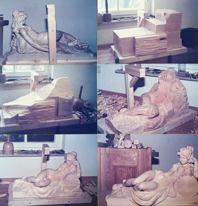 Hier sehen Sie ein paar wenige der erforderlichen Arbeitsschritte. Ausgehend vom rohen Holzblock über das grob angelegte Werkstück bis zur fertig ausgearbeiteten Holzfigur.